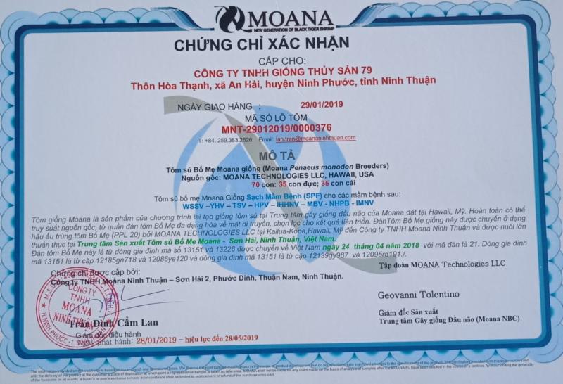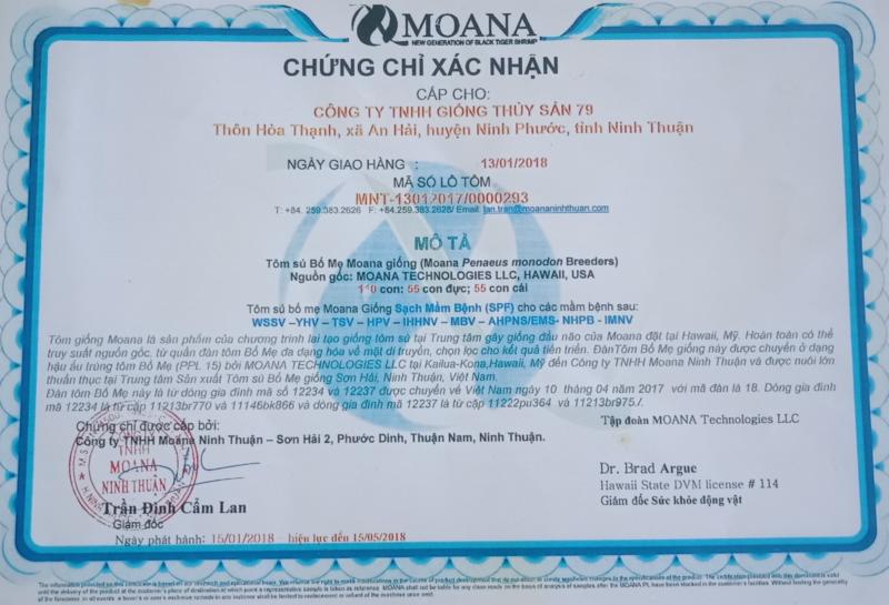 Dưới đây là giấy chứng nhận tôm Bố Mẹ Moana từ tháng 01/2018 đến tháng 12/2020 của công ty chúng tôi: