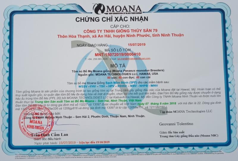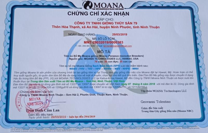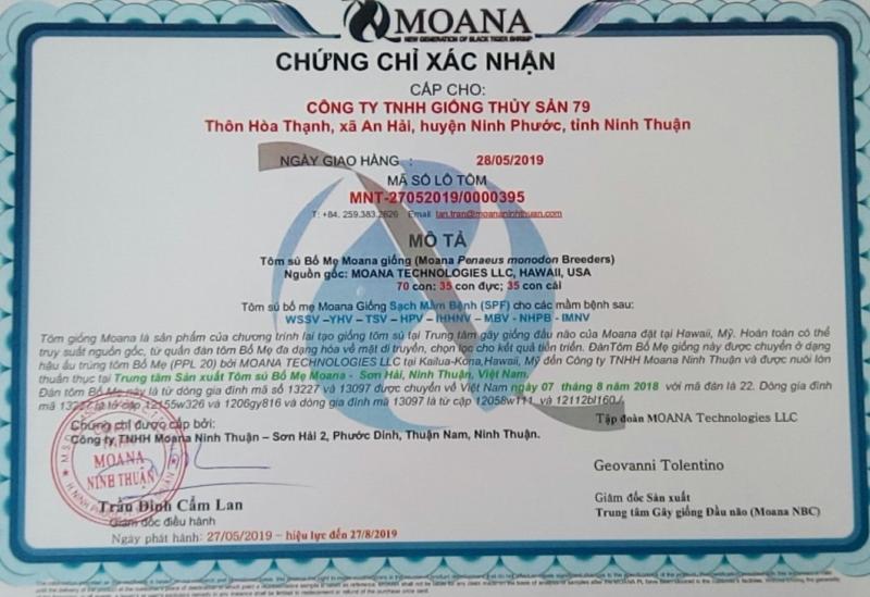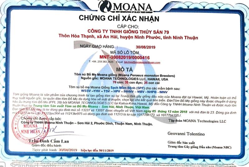 Cho nên mỗi một lần nhập tôm bố mẹ từ tập đoàn Moana chúng tôi được cấp một chứng nhận thể hiện số lượng tôm nhập, thế hệ gia đình, hạn sử dụng…..